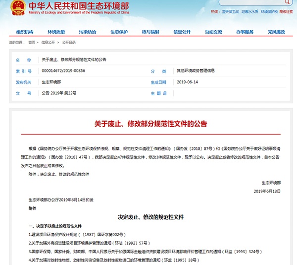 日前,生態環境部發布了《關于廢止、修改部分規范性文件的公告》,詳情如下:
