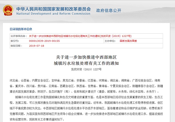 2019年7月18日,國家發(fā)展改革委發(fā)布了《關(guān)于進一步加快推進中西部地區(qū)城鎮(zhèn)污水垃圾處理有關(guān)工作的通知》,詳情如下: