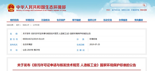 生態(tài)環(huán)境部關(guān)于發(fā)布《排污許可證申請(qǐng)與核發(fā)技術(shù)規(guī)范 人造板工業(yè)》國(guó)家環(huán)境保護(hù)標(biāo)準(zhǔn)的公告