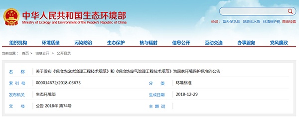 生態環境部關于發布《銅冶煉廢水治理工程技術規范》和《銅冶煉廢氣治理工程技術規范》為國家環境保護標準的公告