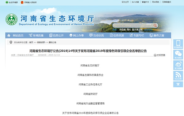 河南省生態環境廳公告〔2019〕14號關于發布河南省2019年度綠色環保引領企業名單的公告