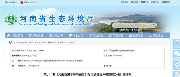 2019年12月31日,河南省生態環境廳會同河南省發展改革委、河南省市場監督管理局、河南省稅務局、人民銀行鄭州中心支行、河南省銀保監局于聯合制定了《河南省生態環境服務機構環境信用評價管理辦法》。