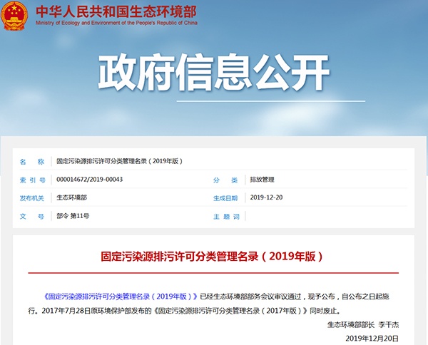 2019年12月20日,生態環境部發布了《固定污染源排污許可分類管理名錄(2019年版)》,詳情如下: