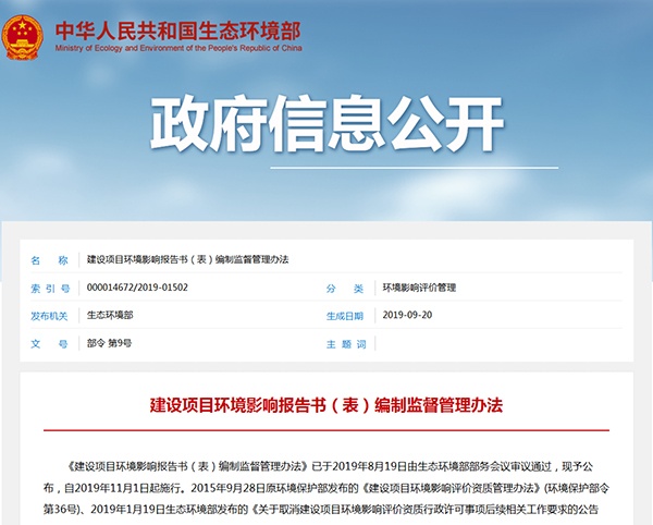 2019年9月20日,生態(tài)環(huán)境部發(fā)布了《建設項目環(huán)境影響報告書(表)編制監(jiān)督管理辦法》,詳情如下: