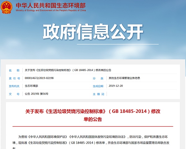 2019年12月20日,生態(tài)環(huán)境部發(fā)布了《生活垃圾焚燒污染控制標準》(GB 18485-2014)修改單,詳情如下: