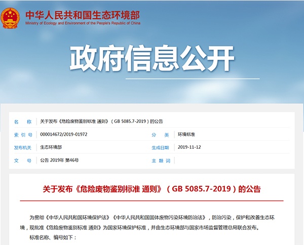 2019年11月12日,生態環境部發布了《危險廢物鑒別標準 通則》(GB 5085.7-2019),詳情如下: