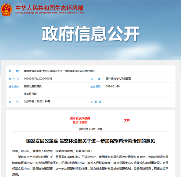 2020年1月19日,國(guó)家發(fā)展改革委、生態(tài)環(huán)境部聯(lián)合印發(fā)了《關(guān)于進(jìn)一步加強(qiáng)塑料污染治理的意見(jiàn)》,詳情如下: