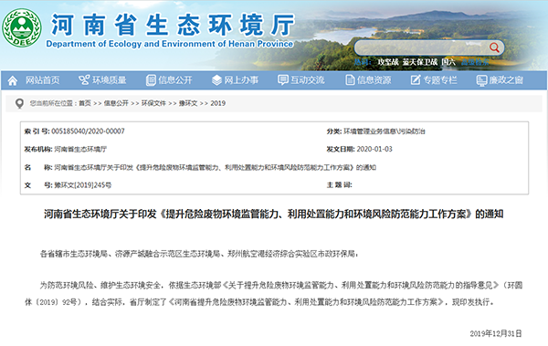 2020年1月3日,河南省生態(tài)環(huán)境廳印發(fā)了《提升危險(xiǎn)廢物環(huán)境監(jiān)管能力、利用處置能力和環(huán)境風(fēng)險(xiǎn)防范能力工作方案》,詳情如下: