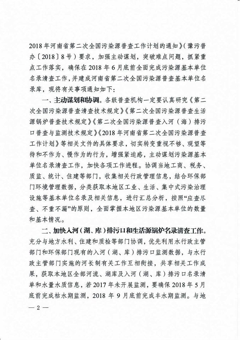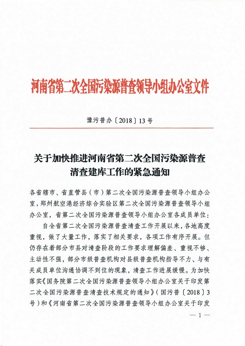 豫污普辦【2018】13號關于加快推進河南省第二次全國污染源普查清查建庫工作的緊急通知