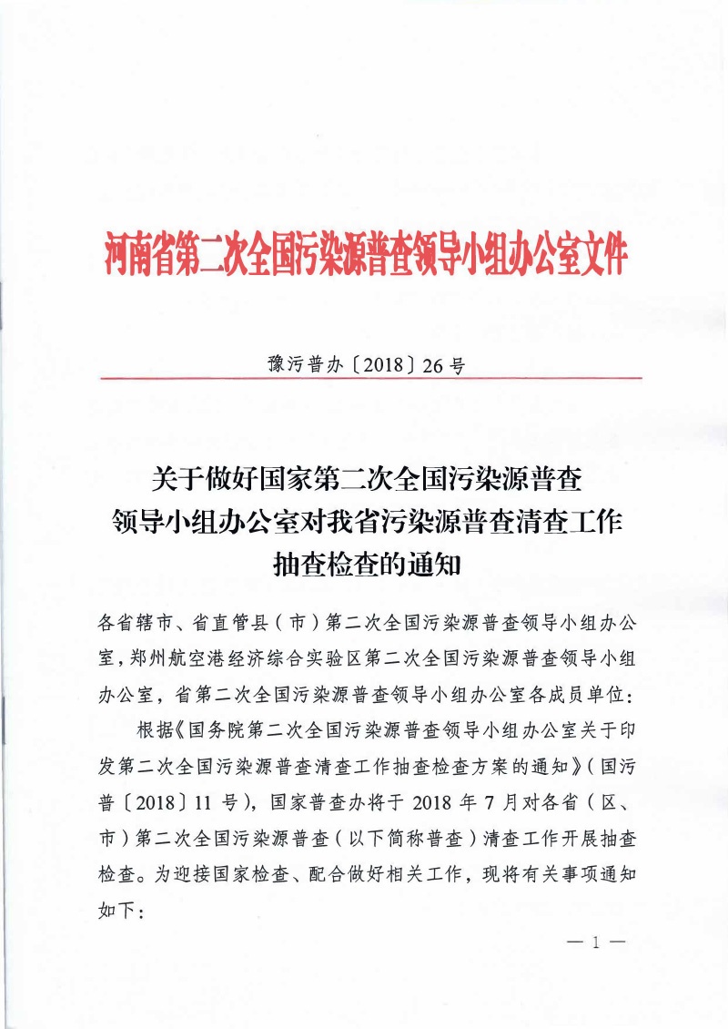 豫污普辦【2018】26號(hào)關(guān)于做好國(guó)家二污普領(lǐng)導(dǎo)小組辦公室對(duì)我省清查工作抽查檢查的通知
