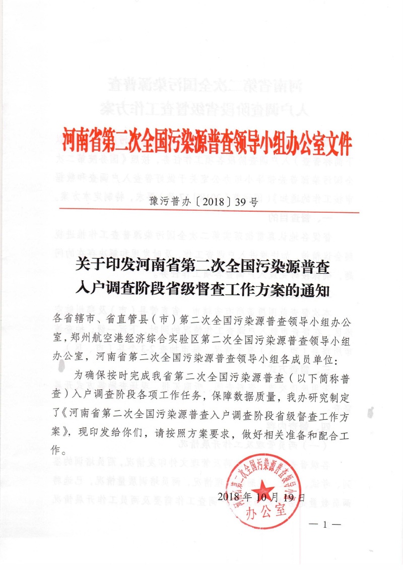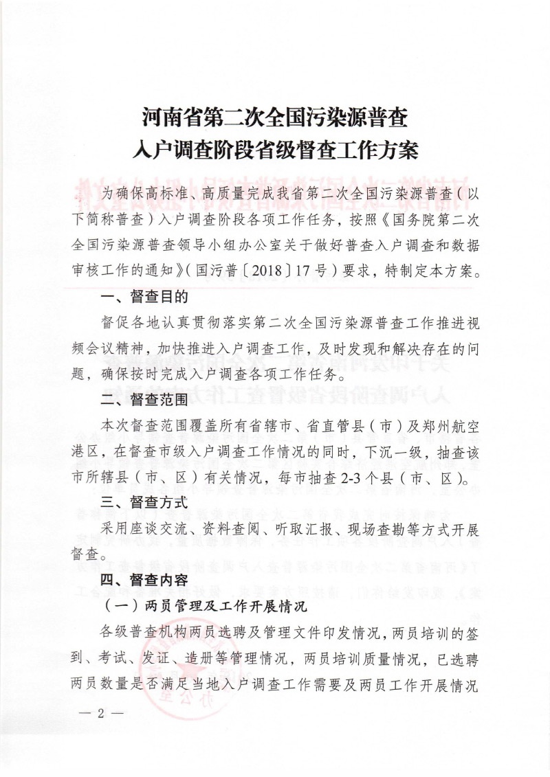 豫污普辦【2018】39號關于印發(fā)河南省第二次全國污染源普查入戶調查階段省級督查工作方案的通知